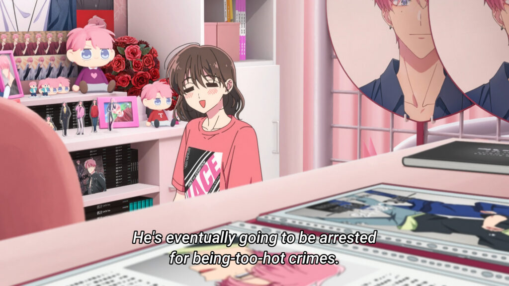 I suppose Tamon’s B-Side probably falls into the guilty pleasure slot this season. I know of no such thing as self restraint, so it’s naturally my favorite of the season as well. I love ridiculous, unbelievable shoujo plotlines, and I probably always will. Utage’s unconventional personality never fails to disappoint, giving unexpected and genuinely funny reactions to discovering the many sides of her oshi. Plus, Saori Hayami of Cosmic Princess Kaguya fame voices Utage. Her voice has deeply infiltrated my brain since her appearance in Pseudo Harem a couple of years ago. Hearing it drives me insane (positive).